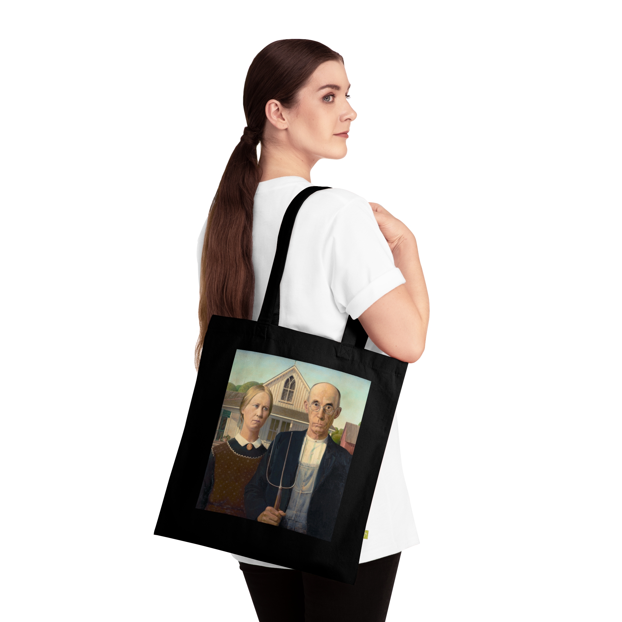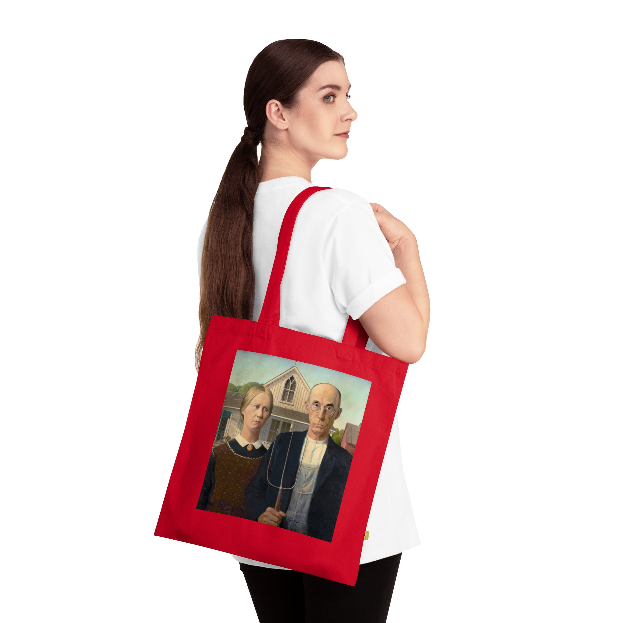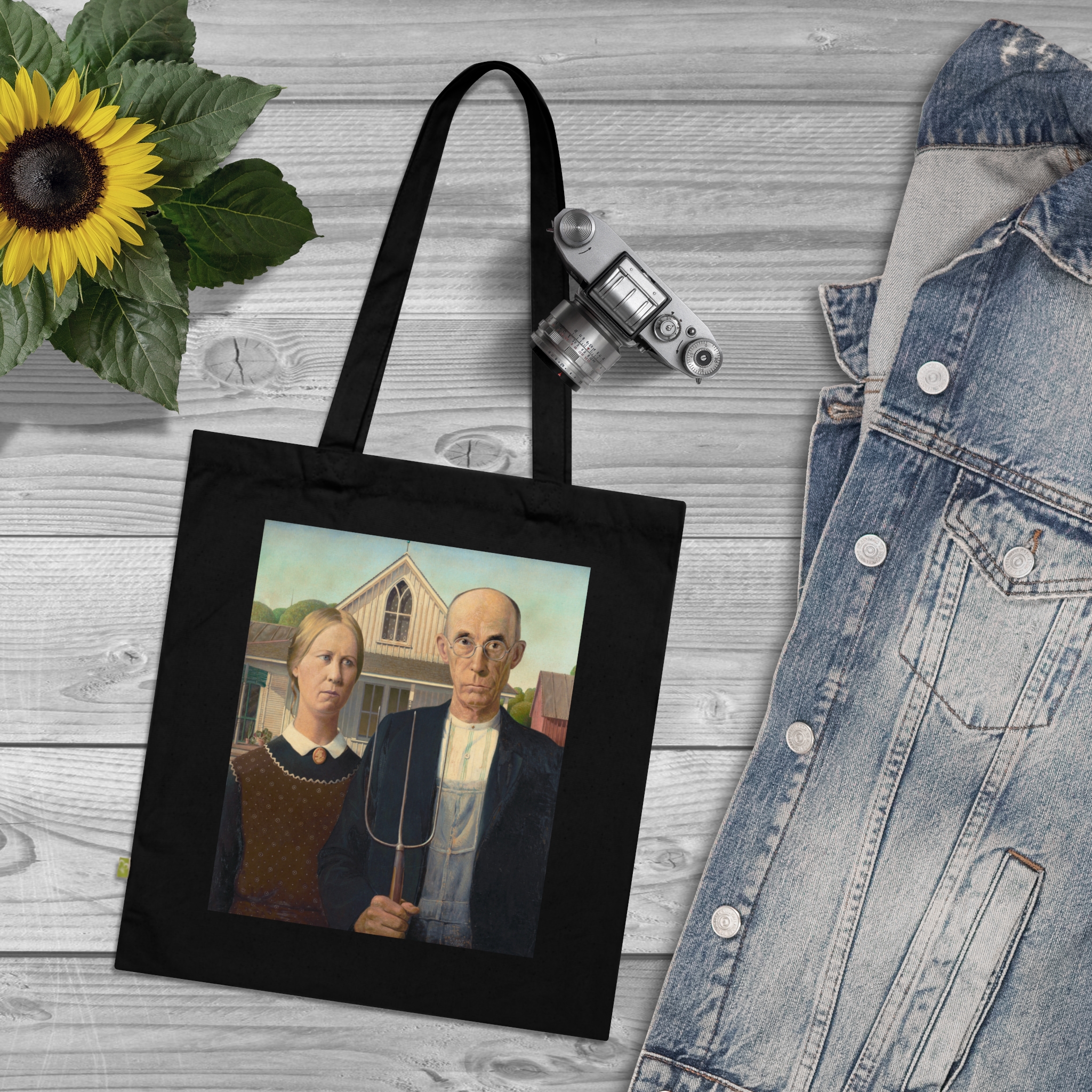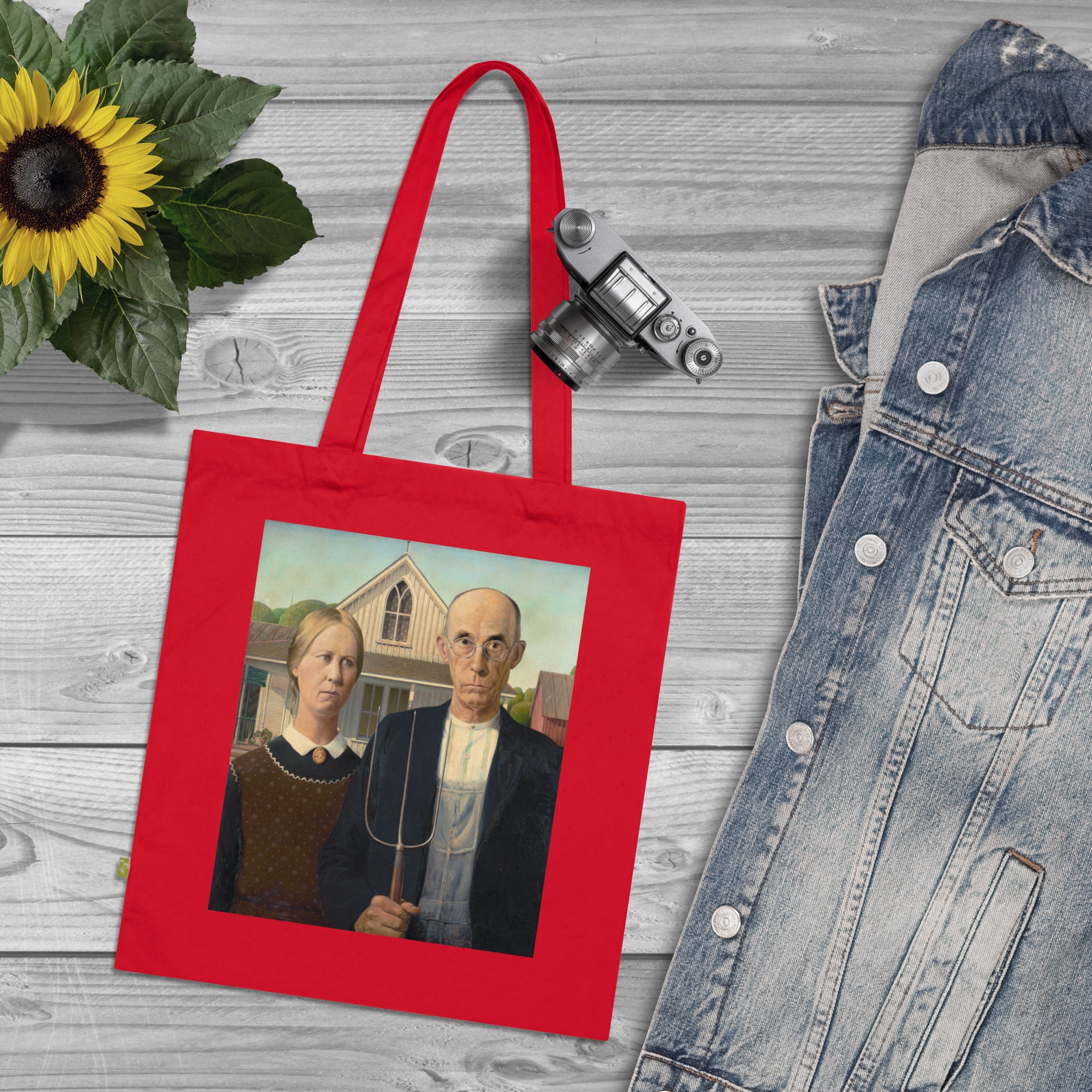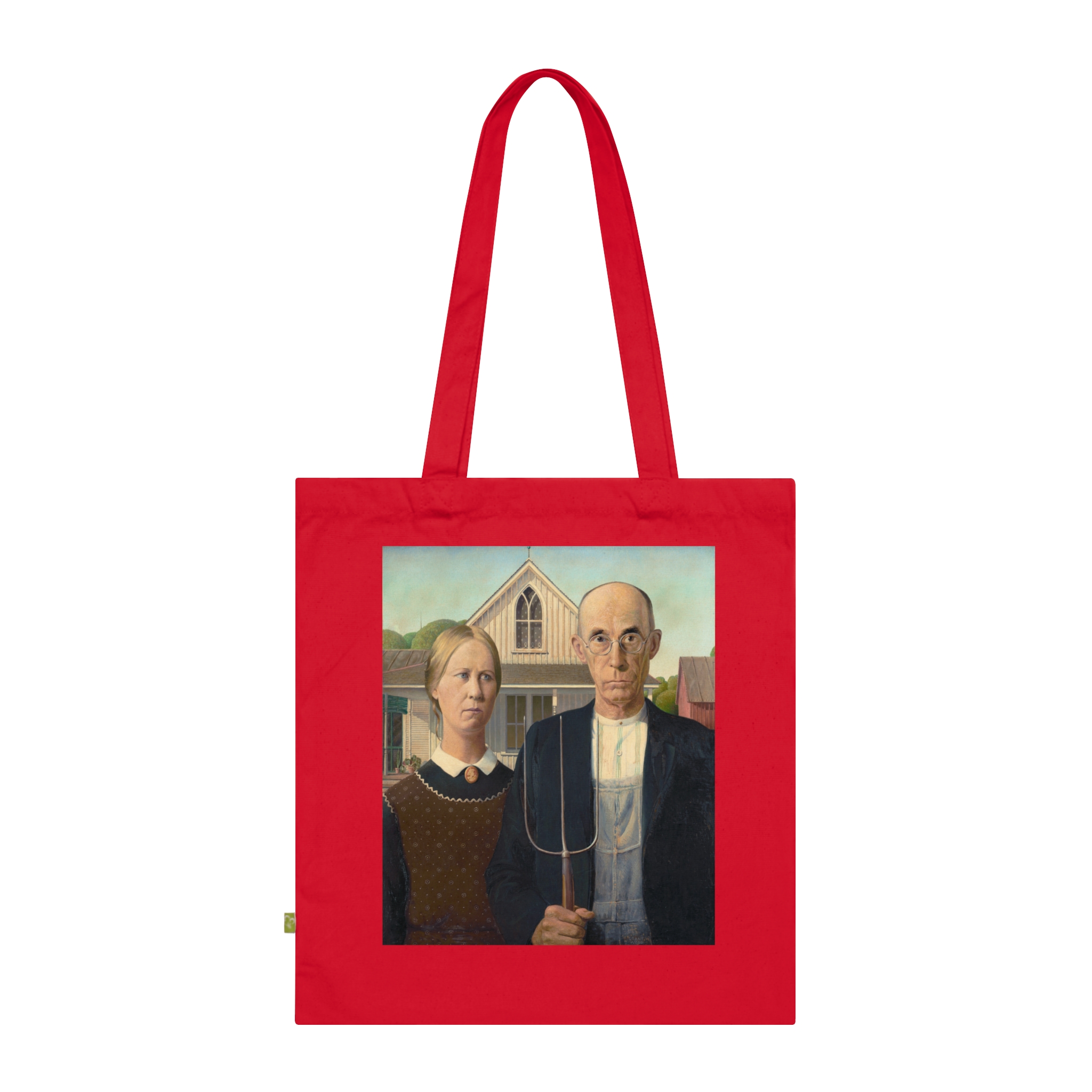 Created during the Great Depression, ‘American Gothic’ reflects the resilience of rural America. Wood sought to portray the strength of American values through his art. Featuring American Gothic by Grant Wood, printed on a durable everyday canvas tote. Daily life, made slightly more interesting.