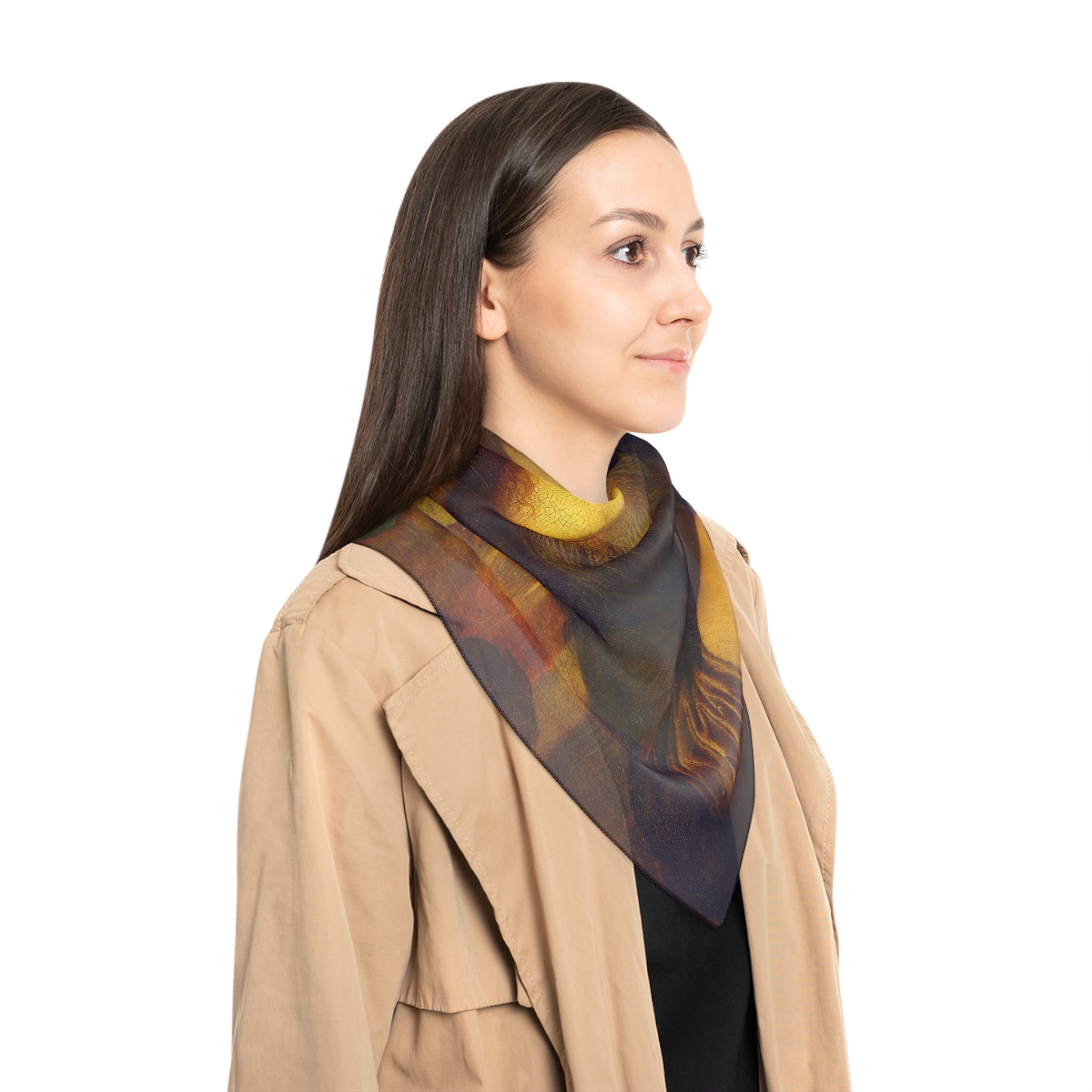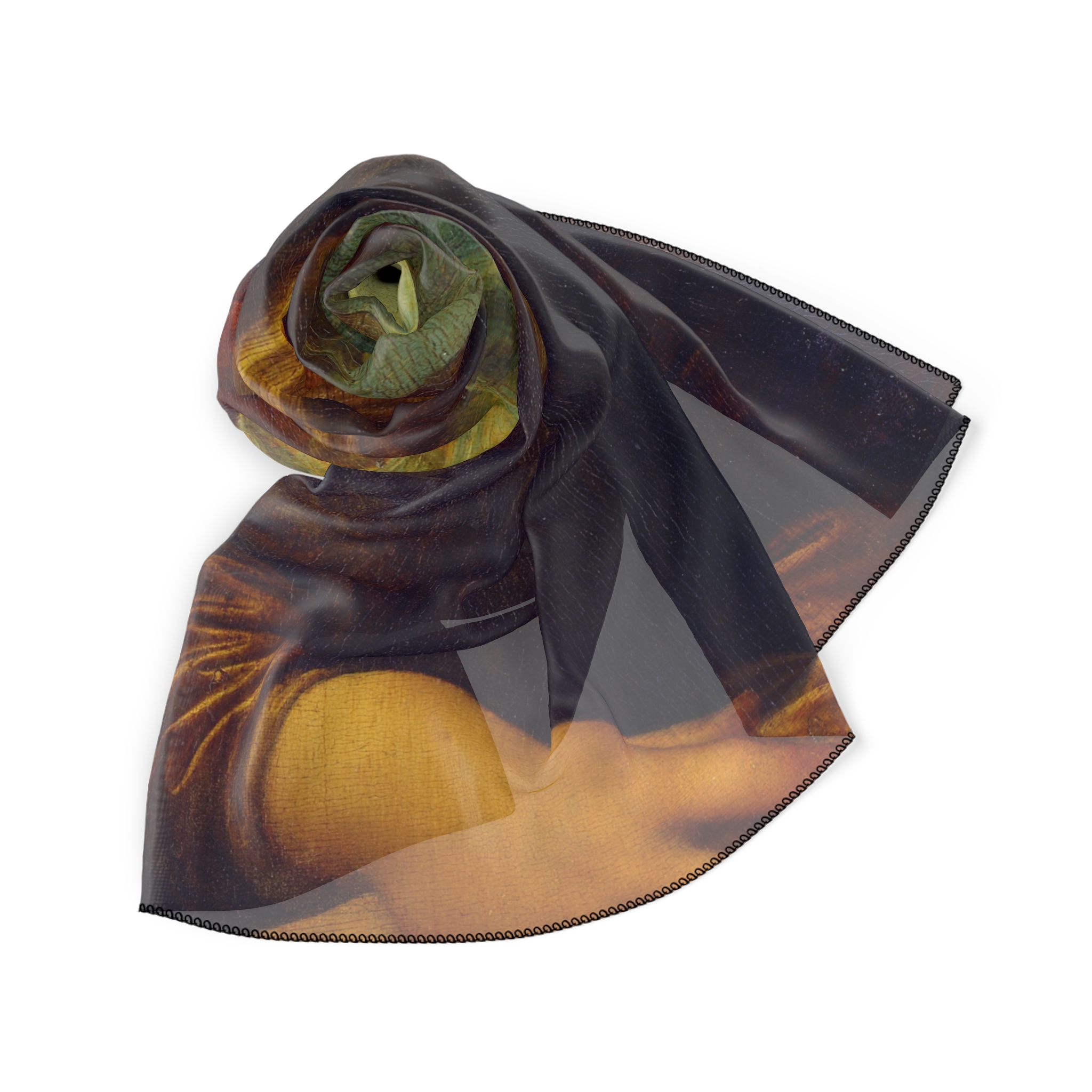 Featuring Mona Lisa by Leonardo da Vinci, printed on a lightweight polyester scarf.